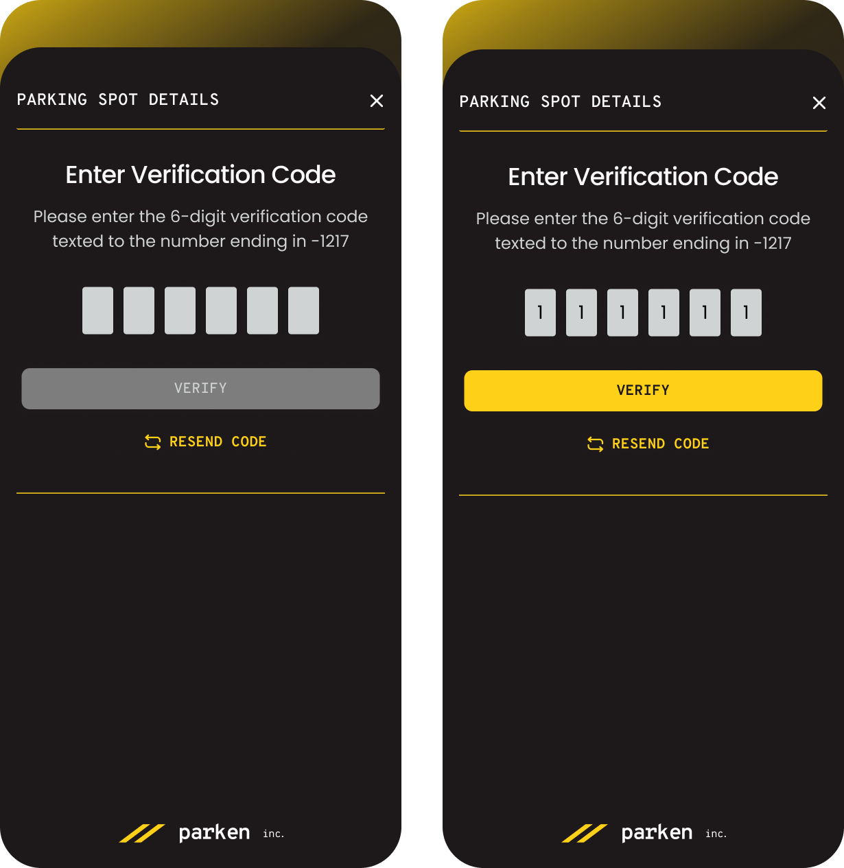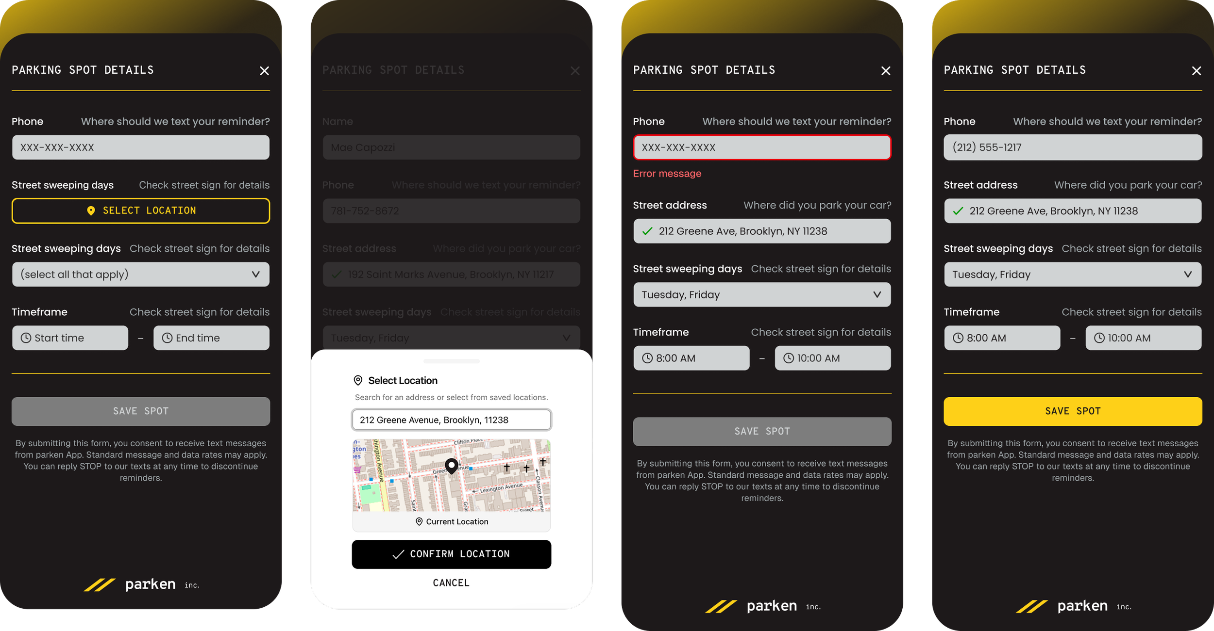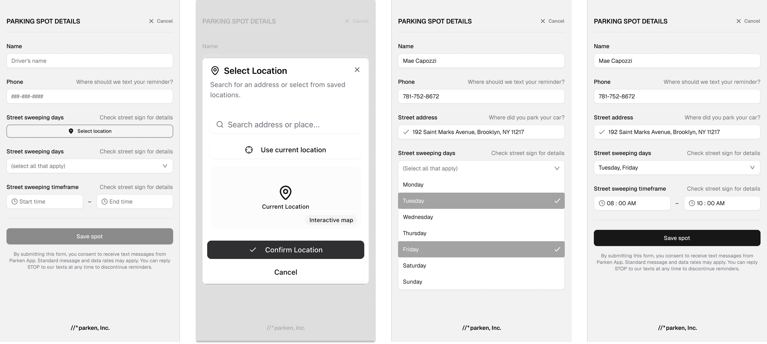 The Park Car CTA takes users to Parking Spot Details form. The form collects contact information and street parking details.