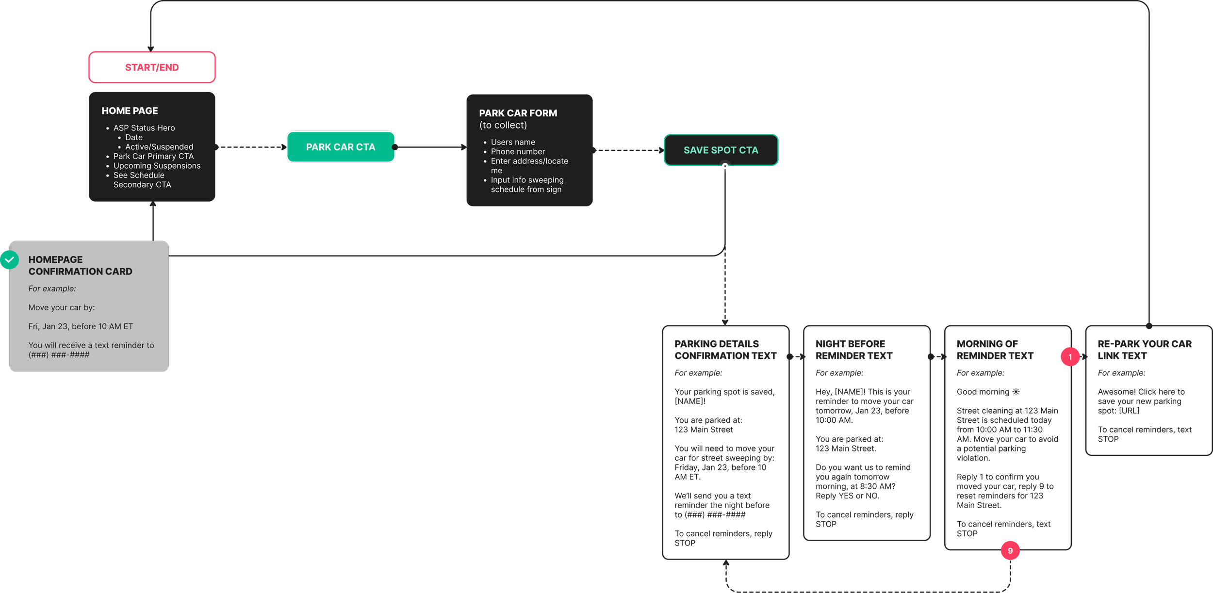 A confirmation badge is added to the initial view of the web app to validate task completion. It includes date users will have to move their car for street sweeping, so that the text reminder notification is not the first time they’re encountering that information.
