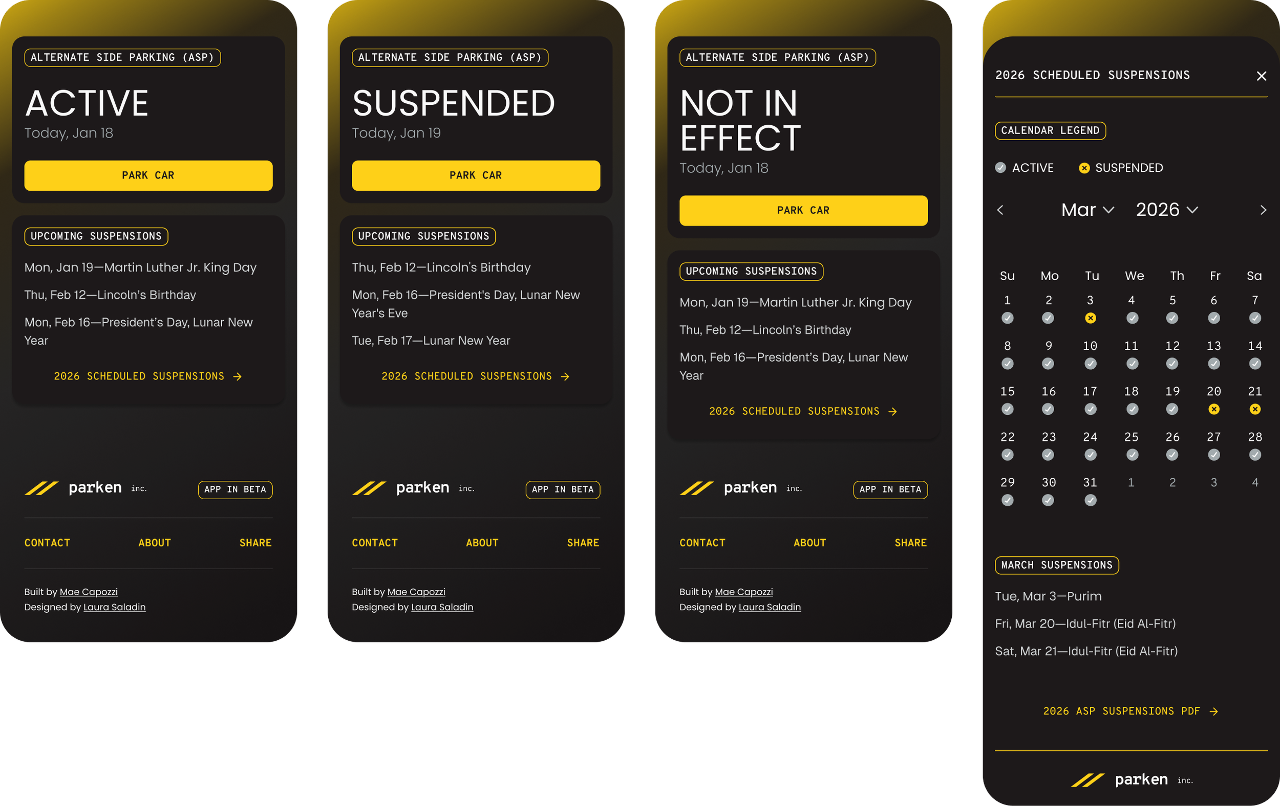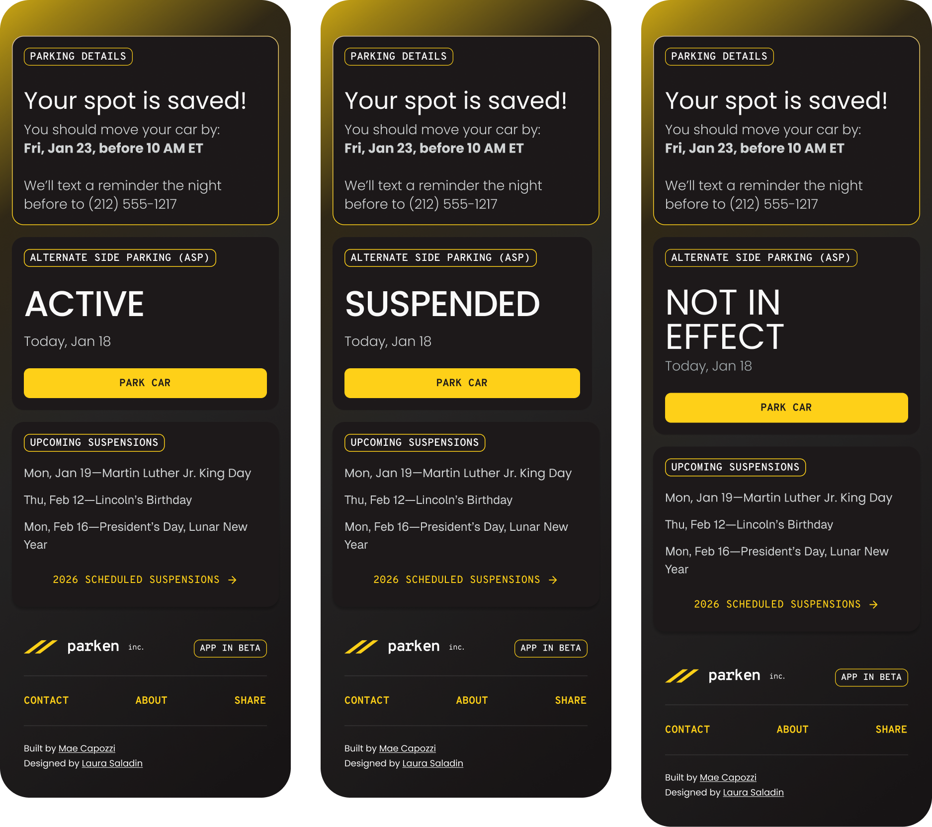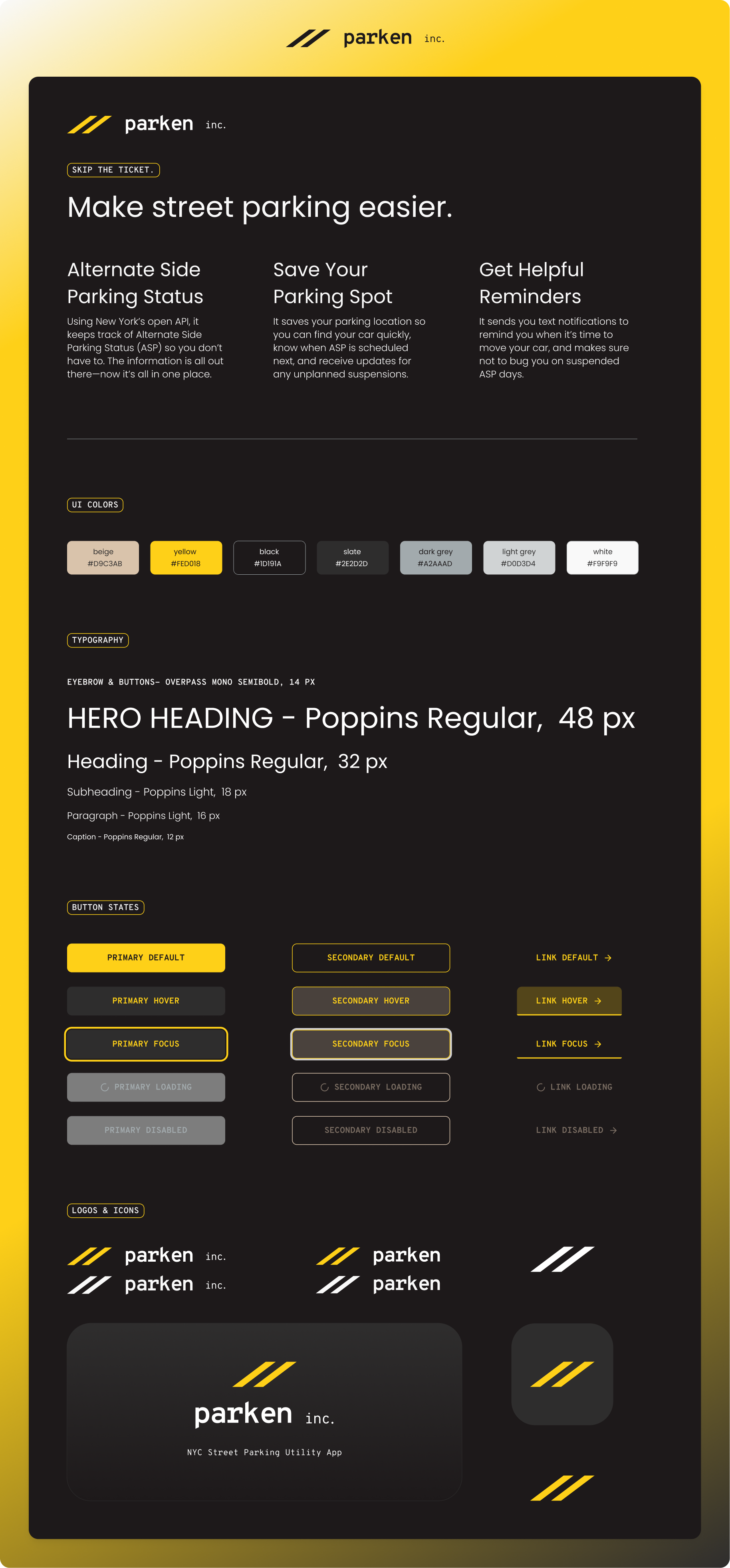 I wanted to develop a dynamic brand identity that reflected the hustle of NYC street parking. To do so, I built a UI palette around colors like traffic yellow and asphalt. I chose Overpass Mono for buttons, eyebrows, and the logo as it is used in some street signage. I chose Poppins as the complementary typeface for paragraph text because it is a sans-serif, geometric font with lots of versatility and roundedness that contrasts well with the utilitarian vibe of Overpass Mono. Lastly, the logos and icons reference the semiotics of traffic—in this case, double yellow lines. They’re also a tongue-in-cheek reference to some New Yorkers’ workaround for moving their car: double parking across the street until sweeping is over, so they don’t lose their prime spot.